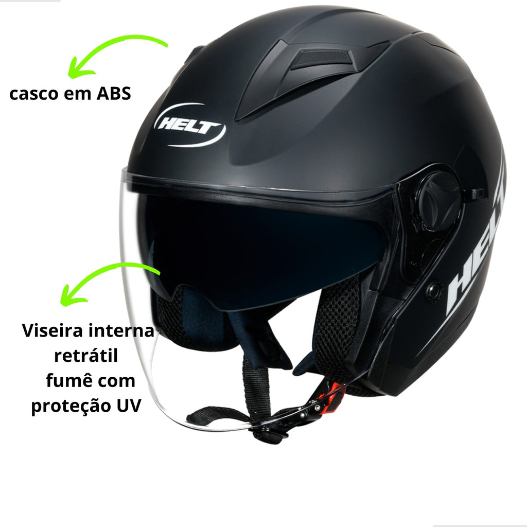 Todos os capacetes Helt são construídos com casco em ABS de alta resistência, garantindo proteção eficaz contra impactos. As viseiras, com dupla curvatura e 2 mm de espessura, possuem tratamento antirrisco e proteção UV, assegurando ampla visão e durabilidade. Além disso, os modelos contam com fecho de engate rápido com ajustes de precisão, facilitando o uso diário. Todos os produtos da marca são certificados pelo INMETRO, atendendo aos padrões de segurança exigidos no Brasil.